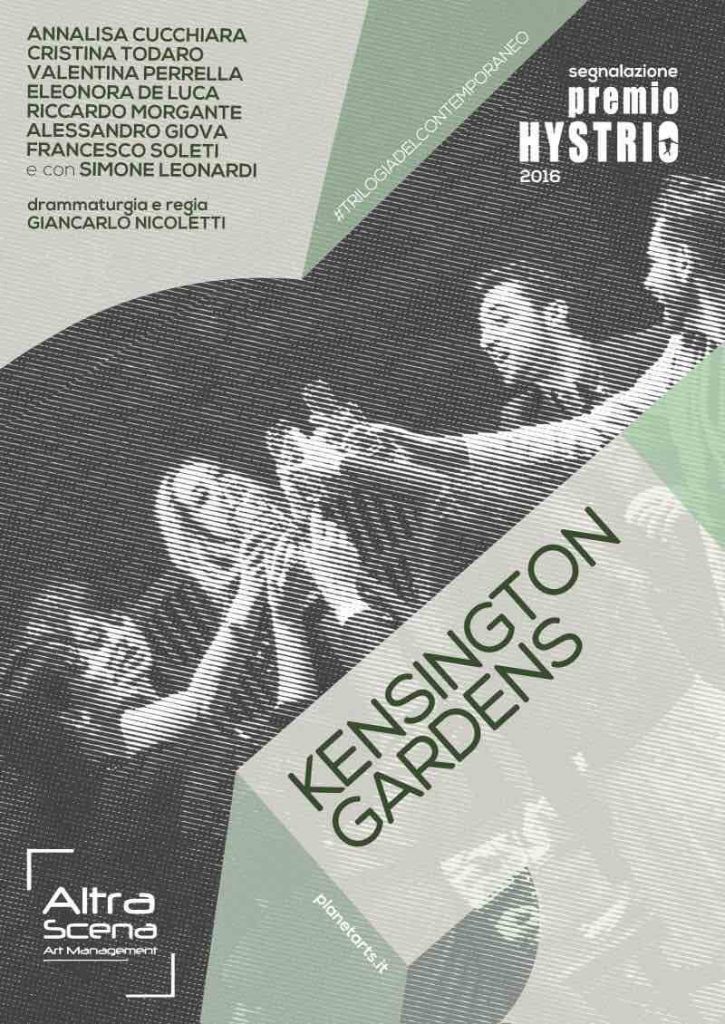 In Kensington Gardens si tenta l’impianto di contesti e personaggi tratti da Cechov – e più specificatamente da alcuni caratteri e dall’intreccio de “Il Gabbiano” – su una piattaforma testuale e situazionale di teatro contemporaneo. Partendo da quel “territorio del possibile” intrinseco alla drammaturgia cechoviana, si sviluppa un discorso più ampio ed estremamente attuale sui paradossi dei legami affettivi e di sangue, sulle speranze insoddisfatte, sull’incapacità di ammettere lo stato delle cose, e sulle nozioni di Stato, libertà, identità culturale, razza. Una prova di “cechovizzazione” del contemporaneo, in cui Nicoletti sperimenta la sintesi, con il suo stile fortemente identitario, fra gli archetipi del classico e le urgenze del contemporaneo, nel suo lavoro più inquietante, maturo e traboccante di realtà drammatica e tragicomica.